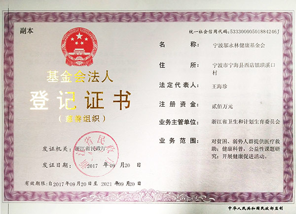 宁波邬永林健康基金会,成立于2010年10月,是在浙江省民政厅注册、由浙江省卫生健康委主管的非公募基金会。基金会的原始基金数额为人民币贰佰万元,来源于华体会平台-华体会(中国) 。《慈善法》颁布后,本基金会被认定为慈善组织。